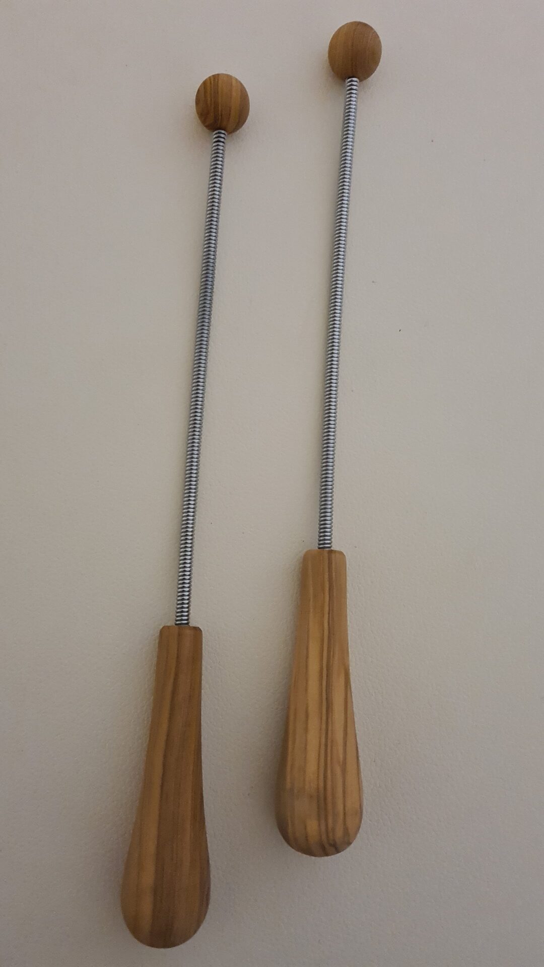 Diese Spiralfederrute besteht aus einem hochwertigen, handgedrechselten Griff aus Birnenholz, einer Kugel aus Buchenholz und einer Spiralfeder aus Stahl.